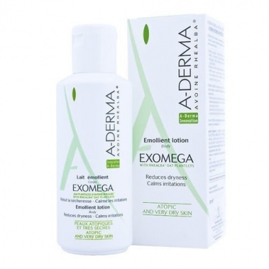 Aderma Exomega Emollient Lotion is used to reduce skin dryness and calm irritations.